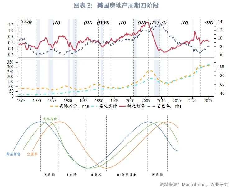 供需平衡,房地产有限泡沫化。从销售、空置率、价格三个维度观察,2023年第一季度以来,美国房地产市场进入供给过剩期(对应图表中阶段III),这一阶段的特征是:销售回升、空置率回升、房价上涨。当前美国房地产市场依然处于这一阶段,泡沫化程度较低。美国名义房价和实际房价均保持温和上涨,新屋销售较为稳定,租住空置率缓慢回升至约8%,但绝对水平依然明显低于历史上泡沫化后期。根据MBA预测,2026年上半年购房需求同比增长,能够对冲经济下行压力;下半年购房需求同比转弱。从供需而言,通常认为新屋、成屋的可供销售月数在4~6个月为供需平衡状态,若大于6个月为供给过剩的买方市场,若小于4个月为供给短缺的卖方市场。目前可供销售月数约为5个月,市场已经从此前的供给短缺转向供给平衡。泡沫化后期往往会出现严重的供给过剩,目前尚不符合这一特征。