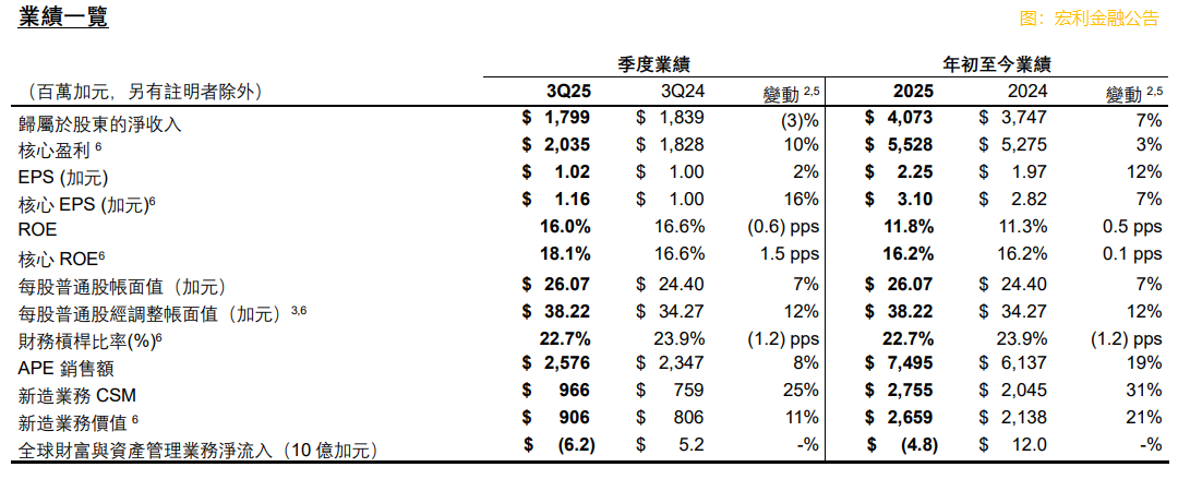 期內,核心EPS为1.16加元,较2024年第三季度的水平增长16%;EPS为1.02加元,较2024年第三季度的水平增长2%;撇除ECL变动的影响,核心EPS为1.14加元,较2024年第三季度的水平上升11%。集团核心ROE为18.1%,而ROE为16.0%。