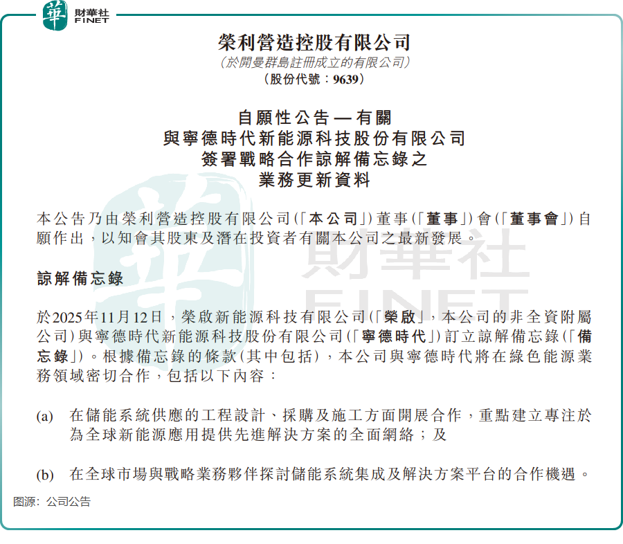 与“宁王”达成合作,标志着荣利营造正式切入新能源及储能赛道,实现从传统建筑承建商向绿色科技服务商的战略转型。宁德时代提供的技术与品牌背书,将有力增强市场对公司的信心。