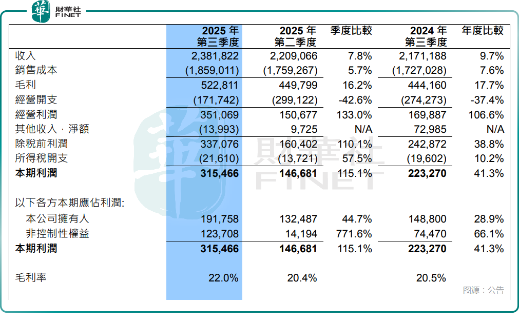 报告显示,2025年第三季度,中芯国际实现销售收入23.82亿美元,同比增长9.7%,环比增长7.8%;季度利润为3.15亿美元,同比增长41.3%,环比增长115.1%;季度毛利率为22.0%,同比上升1.5个百分点,环比上升1.6个百分点。