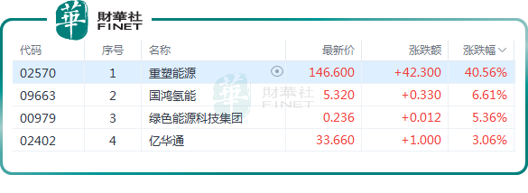 在港股阵营,截至收盘,重塑能源(02570.HK)表现最为突出,涨幅达40.56%;国富氢能(02582.HK)涨6.7%,国鸿氢能(09663.HK)涨6.61%,亿华通(02402.HK)涨3.06%,中集安瑞科(03899.HK)、京城机电股份(00187.HK)等氢能源概念股跟涨。