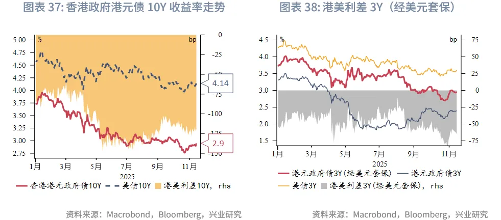 外汇市场方面,受美联储官员谨慎降息言论以及AI泡沫担忧影响,美元指数下行。其中受美元贬值推动,新西兰元表现最为抢眼,而受超预期的第三季度GDP增长助力,马来西亚林吉特兑美元汇率一度升至接近4.12,创下自2024年9月30日以来的新高。本周港汇仍紧贴弱方兑换保证水平,周五收盘于7.8475附近。本周港元兑美元汇率微升但总体在7.77至7.7750窄幅波动,预计港汇仍在目前偏强方区间窄幅震荡,但仍可能受资金流和港美利差上行带动逐步逼近甚至触及7.75。