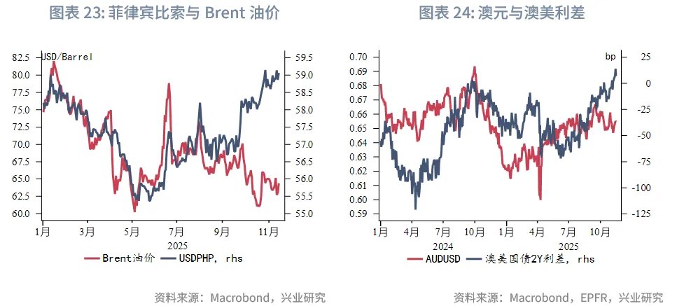 东南亚:受益于稳健内需和强劲出口,马来西亚第三季度增速加快。马来西亚第三季度经济同比增速提升0.8个百分点至5.2%。在就业市场转暖和政府支持措施的背景下,居民消费同比增长5.1%,对增长贡献最大,净出口持续强劲。在前三个季度经济增长4.7%的基础上,马来西亚2025年全年增速有望超出政府设定的4%-4.8%的目标。