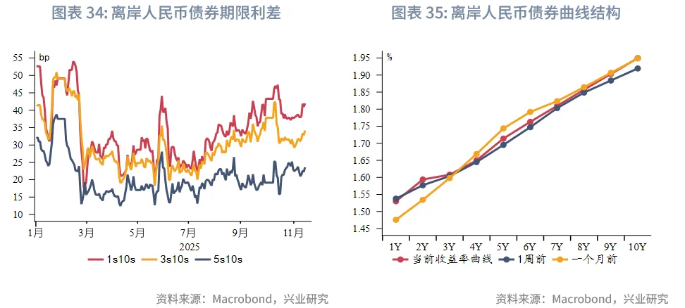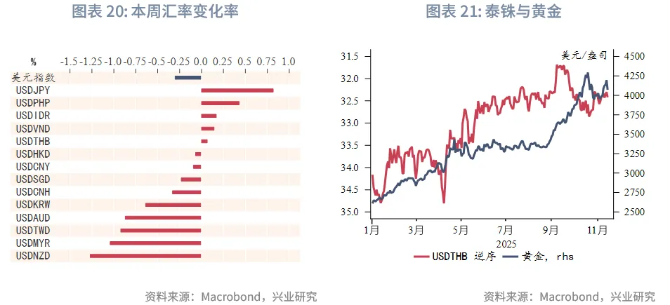 本周美元指数整体呈下行趋势。受美联储官员谨慎降息言论以及AI泡沫担忧影响,美元跟随美股下跌,美元避险属性被削弱。新西兰元表现最为抢眼,一方面受美元贬值推动,另一方面新西兰联储放宽抵押贷款价值比限制的举措有助于经济复苏。受超预期的第三季度GDP增长助力,马来西亚林吉特是本周表现最强劲的亚太新兴市场货币,兑美元汇率一度升至接近4.12,创下自2024年9月30日以来的新高。澳元本周升值均约1%,超预期的10月就业数据公布后,澳元升至本周位后有所回落。受市场对新政府未来政策预期的影响,日元走势疲软,兑美元汇率一度突破155,跌至九个月的低点,目前在154.5日元附近徘徊。虽然日本财务大臣对汇率波动提出警告,引发了市场对政府干预的猜测,但尚未采取实际行动。受美元走弱和港美利差上行影响,本周港元兑美元汇率微升,但总体在7.77至7.7750窄幅波动,预计港汇仍在目前偏强方区间窄幅震荡,但仍可能受资金流和港美利差上行带动逐步逼近甚至触及7.75。或受美元贬值影响,离岸人民币本周升值幅度靠前,幅度大于在岸人民币。