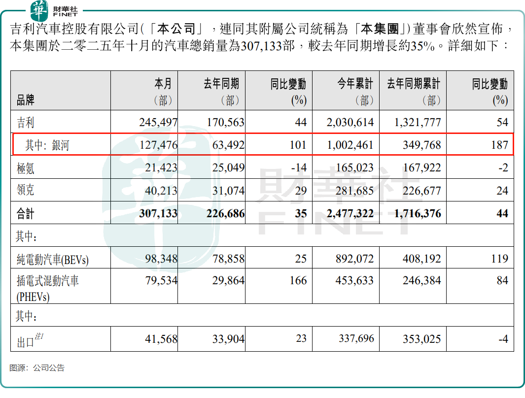 银河系列已成为名副其实的“爆款摇篮”,银河E5、星愿、星舰7等车型上市后表现不俗。今年1-10月,银河系列总销量突破百万辆,同比暴增187%,增速与小鹏汽车(09868.HK)相当,优于零跑汽车(09863.HK)同期的120.7%。