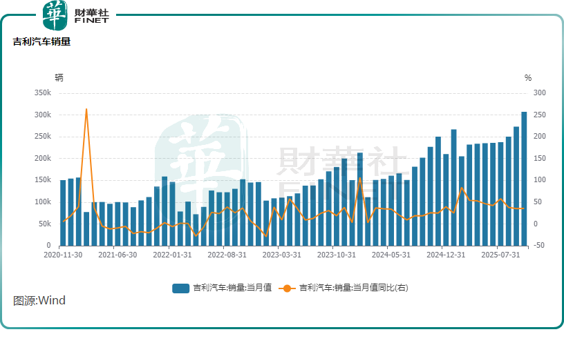 2025年以来,吉利在原有较快增长的基础上持续放量,单月销量同比增幅保持高双位数,创下近五年最佳表现。