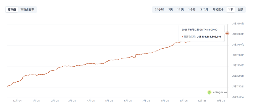 而经历了多年来的膨胀,CoinGecko 数据显示,截至 11 月 14 日,全网稳定币流通量已超过 3000 亿美元,其中 USDT 以 1839 亿美元位列第一,USDC 以 757 亿美元排名第二,两者体量总和接近 2600 亿美元,依然占据绝对优势。