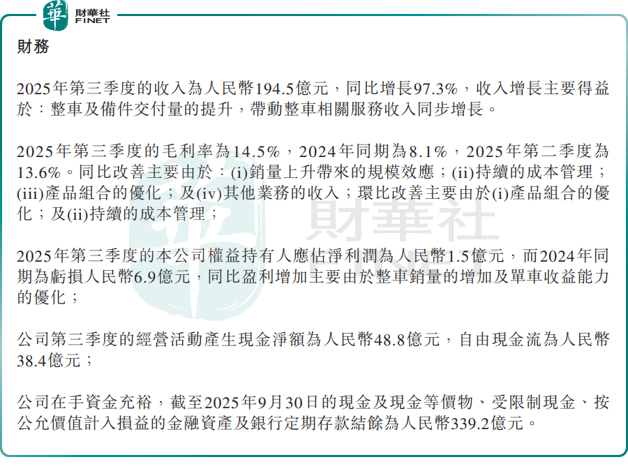 现金流方面,零跑在手资金比较充裕。截至2025年9月30日的现金及现金等价物、受限制现金、按公允价值计入损益的金融资产及短期长期银行定期存款为339.2亿元。第三季度的经营活动产生的现金净额为48.8亿元,同环比均录得增长。