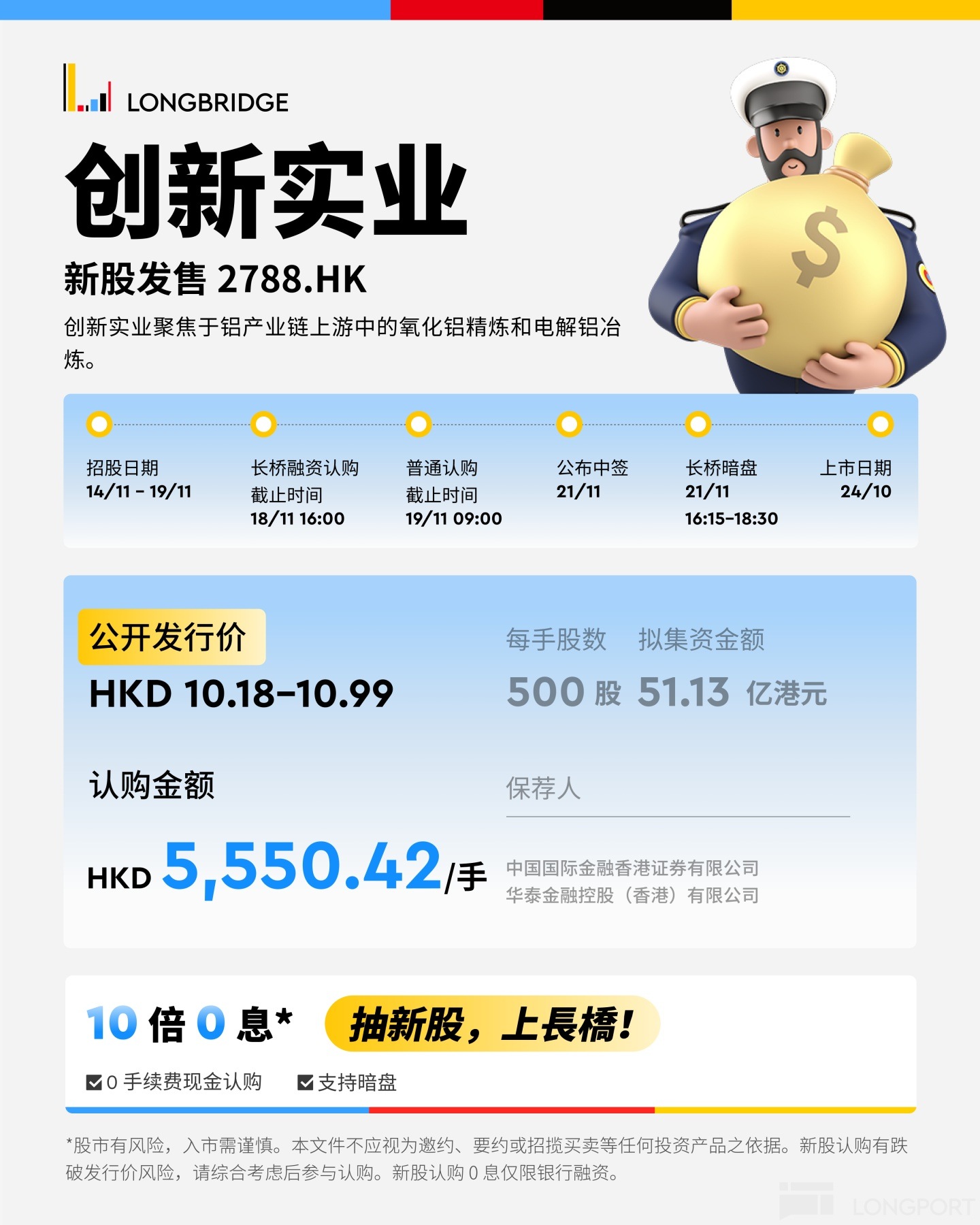 $创新实业(02788.HK) 已于 11 月 14 日正式启动公开招股,招股期至 11 月 19 日结束,并计划于 11 月 24 日正式在港交所主板挂牌上市。
