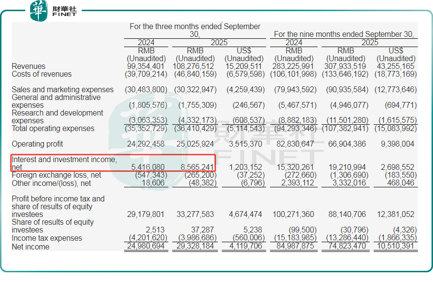 另外,第三季度,研发费用达到43.3亿元,同比大幅增长41%,研发投入再创新高;销售和营销费用为303.2亿元,较去年同期略有下降。