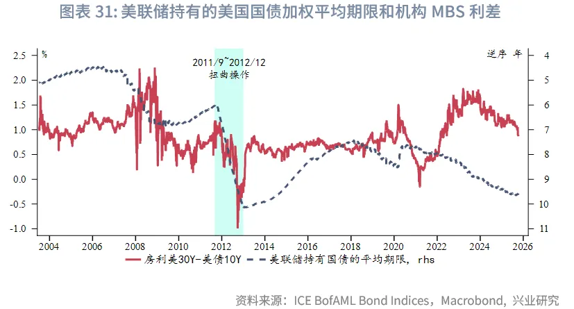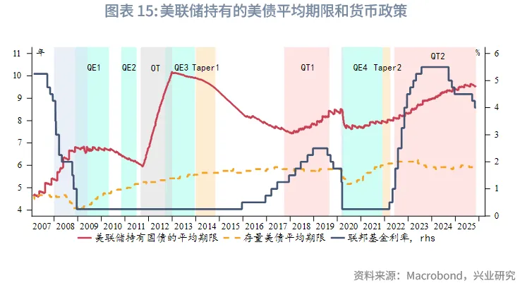 美联储已经宣布2025年12月1日起停止缩表,同时将把到期的机构债券和机构MBS本金再投资于短期国库券(bills)。美联储主席鲍威尔表示,这将促进缩短美联储持有的美债久期。目前美联储持有的美债久期比市场上未偿美债组合的久期要长的多,希望朝着更接近未偿美债组合久期的方向发展。从实际数据看,美联储目前持有的美债组合加权平均期限约为9.5年,而存量美债的加权平均期限仅为5.9年。随着持有的国库券增加,美联储事实上在进行“反向扭曲操作”。