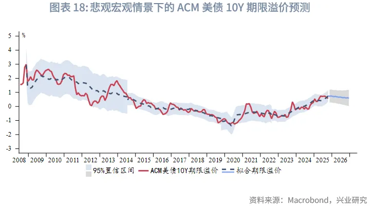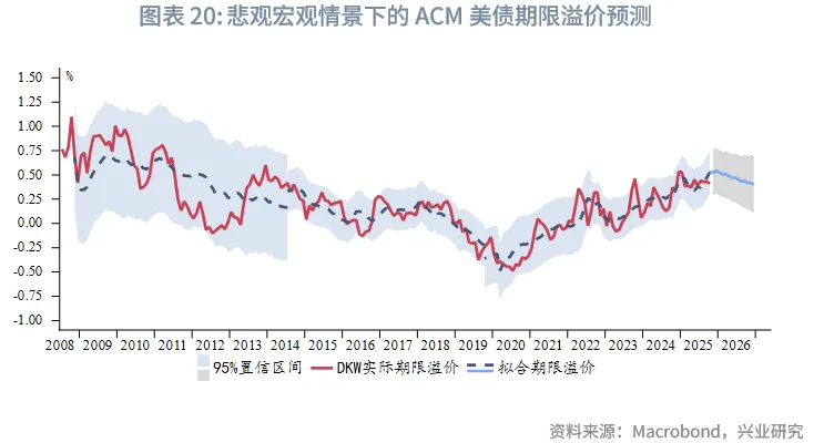 假设悲观宏观情景为:(1)美国库存周期在2026年全年下行。(2)美联储在2025年12月降息25bp,2026年每个季度均降息25bp至2.75%。(3)调整后的美债组合期限温和回升至2025年上半年水平。在此情景下,ACM美债10Y期限溢价全年温和下行,95%置信区间0.02%~1.17%,基本持平2025年波动区间。