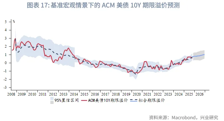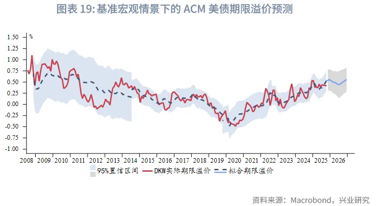 假设基准宏观情景为:(1)美国库存周期在2026年上半年走弱并触底,下半年回升。(2)美联储在2025年12月降息25bp,2026年前三个季度再降息75bp至3%,此后维持利率不变。(3)调整后的美债组合期限继续小幅下降至2019年缩表后期水平。在此情景下,ACM美债10Y期限溢价在2026年上半年走平,下半年趋于上行,95%置信区间0.31%~1.55%,下半年中枢略高于2025年水平。