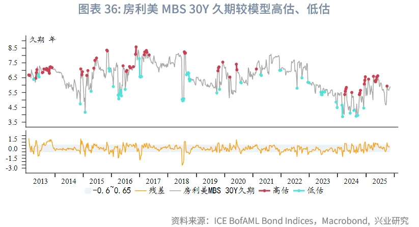 根据我们构建的机构MBS利差模型,基准预期为房利美MBS 30Y相对美债10Y的利差在模型中枢0.9%附近的1倍标准差范围内波动,波动区间约为0.7%~1.3%。参照上文预估的美债收益率区间,可得房利美MBS 30Y收益率的基准区间为:下方支撑3.9%~4.2%,上方阻力5.6%~5.8%。
