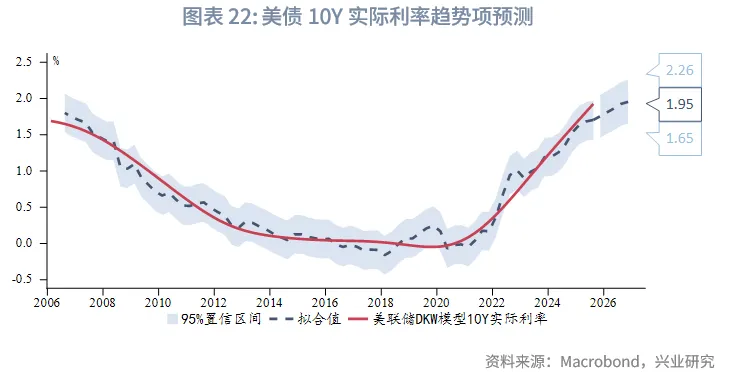 假设2026年:(1)美联储维持当前资产规模(6.7万亿美元)不变;(2)欧央行APP每月到期规模参考欧央行预估情况,PEPP每月到期参考SMA调查预期;(3)日央行在明年第一季度减少4000亿日元购债,第二季度起每季度减少2000亿日元购债;(4)英央行在2026年10月前线性缩减700亿英镑国债;(5)世界经济不确定性指数中枢设定为2025年均值(410);(6)美国老龄人口占比、劳动生产率、世界实际GDP分别参考美国人口普查局、CBO和OECD的预测。根据回归模型的预测结果,2026年美债10Y实际利率(DKW模型)趋势项可能进一步抬升,年末中枢为1.95%,95%置信区间的上下限分别为2.26%、1.65%。