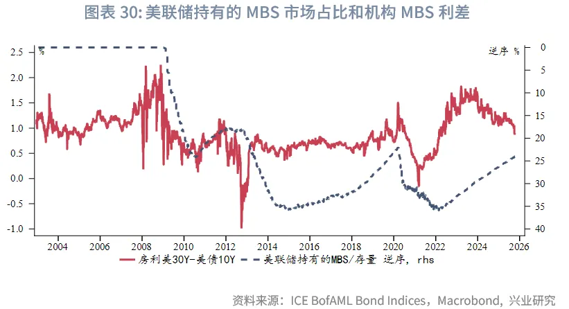 久期方面:从过去1年的数据看,提前还款激励(moneyness)和美联储持有的MBS规模(QT)是最主要的久期影响因素。虽然美联储降息能够提高还款激励,但目前存量房贷市值加权后的总体还款激励较低。而且,利率敏感者通常较早进行了再融资,降息后期和利率维持期再融资活动边际增长放缓。另外,美联储缩表对于机构MBS久期的影响也并非线性,而是呈现出“S曲线(S-Curve)”的非线性特征。美联储连续加息和缩表并行时期,经济增长前景趋弱,市场利率下降,借款人再融资意愿增强,MBS久期下降。在缩表后期,利率敏感的借款人已经完成再融资,在市场利率下降后,还款激励进一步提升的空间有限,机构MBS久期反而出现抬升,即久期和累计缩表规模负相关。这在2022年以来的本轮缩表周期中也已有所体现。未来美联储继续缩减机构MBS,对于久期可能起到一定支撑作用。综上,2026年机构MBS久期进一步大幅下降的可能性较低,或继续在5年左右的中枢震荡。