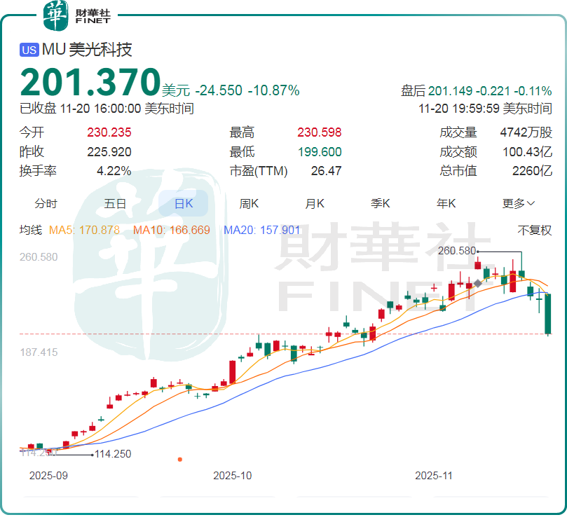 值得注意的是,昨夜美股科技股跳水,AI巨头们遭遇“抛售潮”,当地时间11月20日,美光科技(MU.US)重挫10.87%,甲骨文(ORCL.US)跌6.58%,英伟达(NVDA.US)跌超3%。