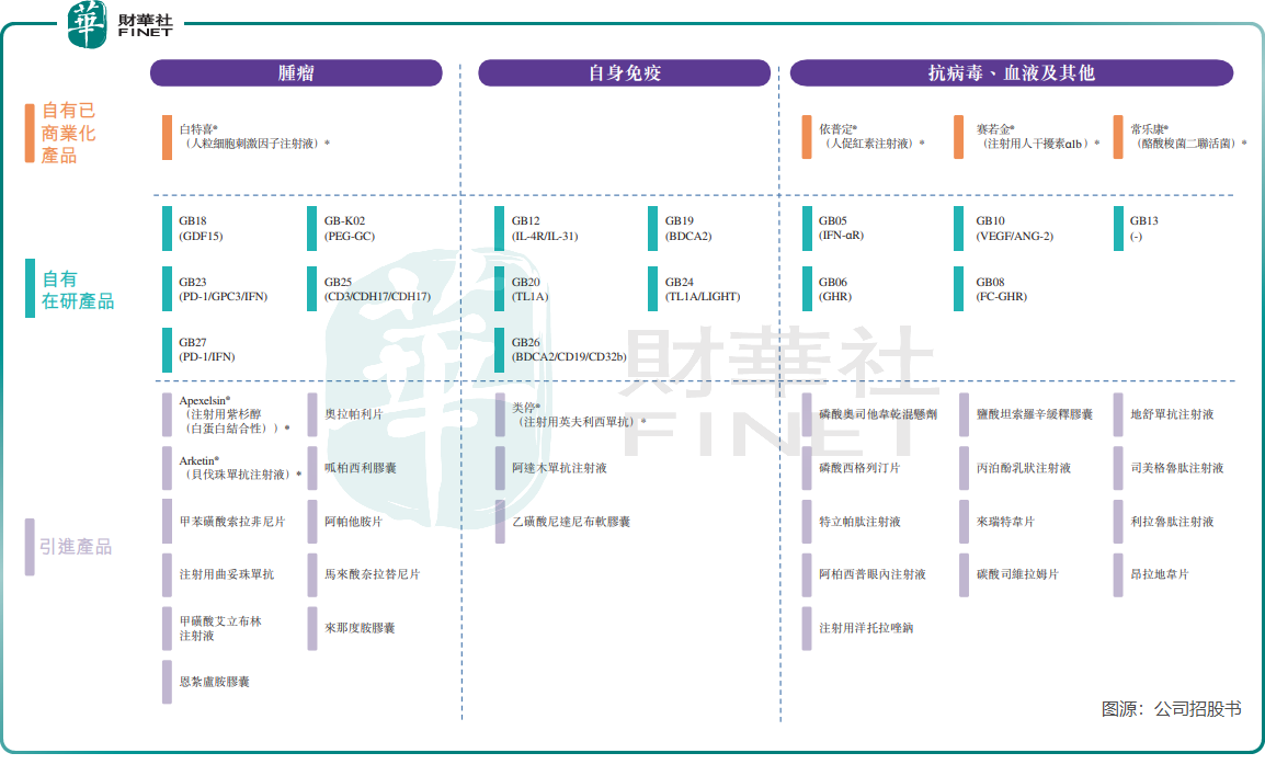 根据招股书披露,公司目前已拥有9款商业化产品,同时布局15个在研项目——其中2个进入III期临床,3个处于II期或I期临床,10个处于临床前阶段,产品矩阵覆盖抗病毒、血液、肿瘤等多个治疗场景。