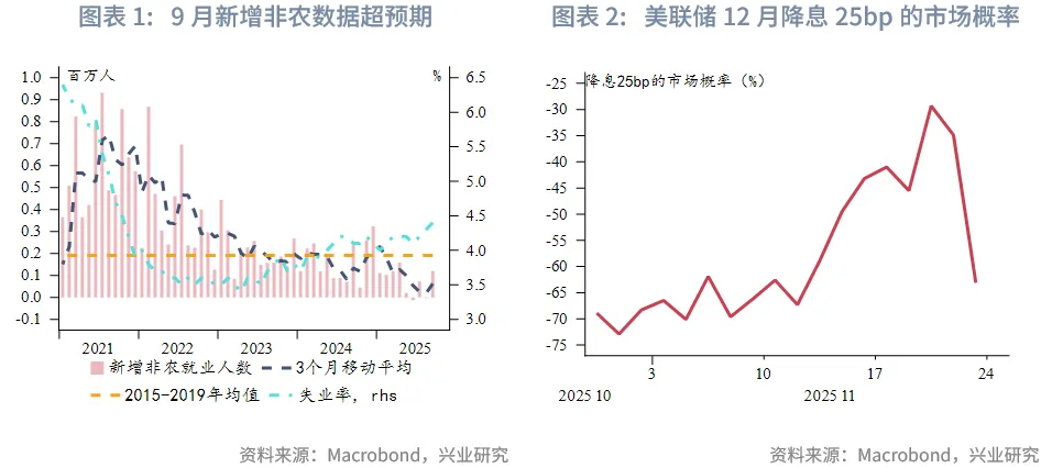 欧美:迟到的9月新增非农就业超预期,受联储官员言论影响,12月降息预期先下后上。9月美国新增非农就业岗位11.9万(预期:5.1万),前两个月累计下修3.4万。新增就业主要集中在私人服务部门(8.7万),特别是医疗保健与社会救助、以及休闲酒店。建筑业明显回暖,推动商品部门9月新增非农就业岗位数量由前值的-3.2万转为1万。政府部门9月新增就业岗位2.2万。由于劳动参与率的提升,失业率超预期上行0.1个百分点至4.4%。工资环比增速回落至0.2%,不及预期的0.3%。新增非农就业在政府停摆前超预期,缓解市场对经济减速的担忧,但就业放缓趋势不变。就业数据公布之后,数位美联储官员持鹰派基调,强调当前通胀偏高,过快的“前置式”降息可能提升通胀风险,12月降息25bp的概率降至30%。但周五纽约联储主席的鸽派表态导致12月降息概率反弹至60%左右。PMI数据显示欧元区11月经济增长保持稳健。11月综合PMI为52.4,基本和上个月持平。尽管11月制造业PMI显示产出有所放缓,但服务业活动维持强劲增长。