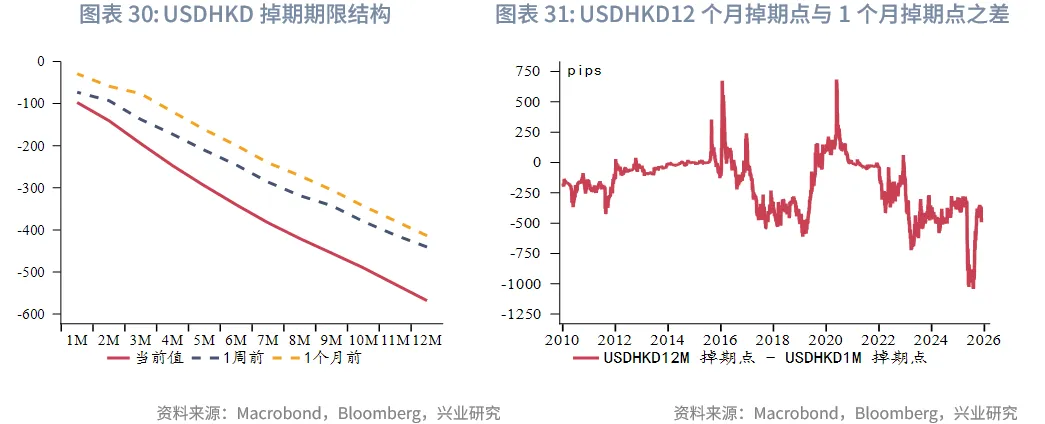 货币市场方面,本周港元资金利率在波动中大幅下行,主要原因或是港股回调和美元走强,导致资金流出,削弱港元需求。此外,1个月期限港美利差小幅震荡下行50bp至-158bp。年末将至,季节性因素可能导致HIBOR波动加剧。在当前联储降息周期和南向资金流入放缓背景下,HIBOR仍有下行空间。各期限离岸人民币资金流动性震荡,1周和1个月期限CNH HIBOR略微波动(5-7bp)分别至1.64%和1.74%。