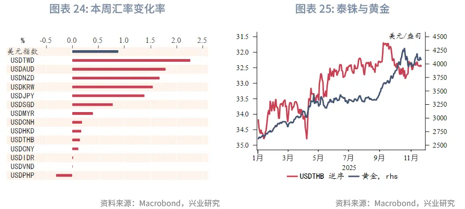 在美联储货币政策预期不断调整下,美元指数在震荡中走高。由于股市受挫和资金外流,亚太新兴市场货币普遍表现较弱,其中新台币兑美元跌至4月以来的新低,是本周表现最弱的亚太货币。市场持续关注日本新政府的经济刺激方案,日元兑美元一度贬值至158,但随后在日本官员口头干预下,日元兑美元小幅回升,收盘于156.39。由于风险资产大幅下挫、避险情绪升温、以及美元走强等因素影响下,新西兰元和澳元兑美元贬值幅度较大。本周港股承压下资金流入放缓,美港利差走阔,港元兑美元汇率微贬升。或受美元升值影响,离岸人民币兑美元小幅贬值,但较其他亚太货币更为坚挺。