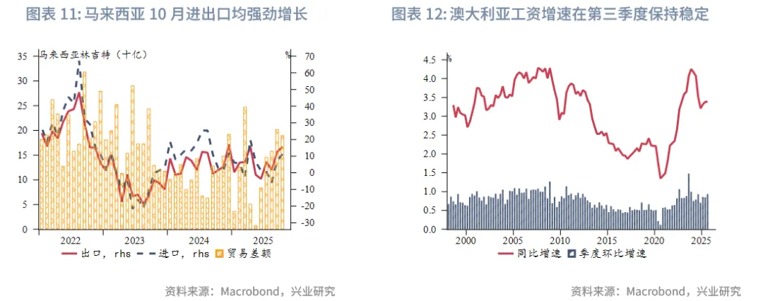 东南亚:泰国经济在第三季度显著放缓,至近四年来的最慢增速,凸显近一年来内政动荡、边境冲突、旅游业疲软等的影响。泰国经济在第三季度环比萎缩0.6%,同比增速从前值2.8%放缓至1.2%,创下四年来的最低增速。净出口对经济增长的贡献上升,但政府支出放缓。新加坡10月非石油出口创2021年11月以来最快增速,同比增长22.2%(预期值:7.5%),主要由非货币黄金和电子产品拉动。10月电子类产品出口增长33.2%,延续了9月30.4%的增长势头。2025年前10个月非石油国内出口累计增长4.1%。新加坡第三季度经济增长超预期上修,政府上调2025年增长预期。得益于强劲的全球贸易,新加坡第三季度GDP增速为4.2%,超出预期值4%和预估值2.9%。新加坡贸工部将2025年的增长预期从1.5%-2.5%上调至4%,但对2026年增长前景持谨慎态度,担忧主要贸易伙伴经济增速放缓可能抑制对东南亚出口,预计新加坡经济增速2026年放缓至1%-3%。马来西亚10月通胀微降至1.3%,进出口增幅均超预期,出口10月同比增速达15.7%(预期:7.6%),进口同比增长11.2%(预期:4.8%)。分行业看,所有主要行业出口均实现增长,特别是电子相关产品的出口额创历史最高记录,棕榈油及其衍生农产品的出口强劲。分出口目的地看,自由贸易协定(FTA)伙伴的出口持续提速,对中国台湾和中国香港的出口均创下历史新高。印尼央行在11月的议息会议上,连续第二个月维持官方利率在4.75%不变。印尼央行仍维持宽松政策导向,表示未来仍有降息空间,以支持国内经济增长。但当前金融市场不确定性很高,货币仍面临贬值压力,因此央行将保持定力,伺机而动。