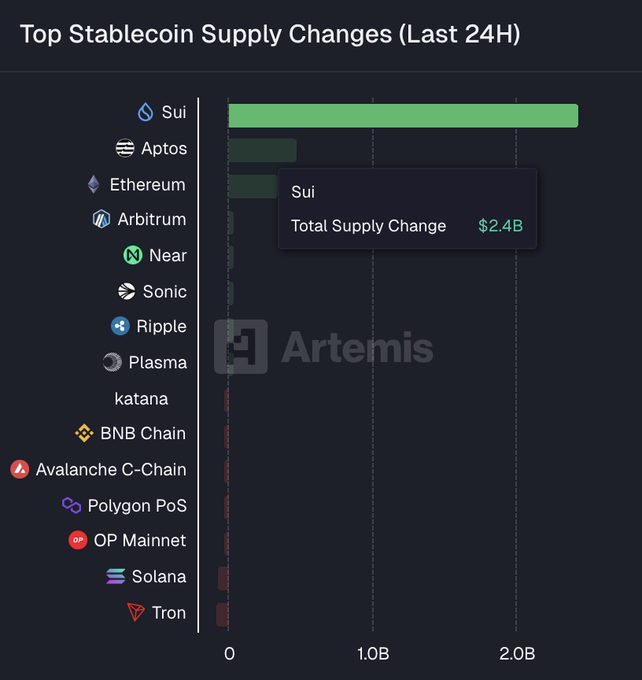 PANews 11月24日消息,据Cointelegraph报道,Artemis数据显示,过去24小时内,Sui在稳定币供应量变化方面领先,净流入达24亿美元,Aptos和以太坊紧随其后。