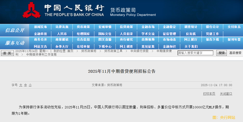 【财华社讯】11月24日,央行公告,为保持银行体系流动性充裕,2025年11月25日,中国人民银行将以固定数量、利率招标、多重价位中标方式开展10000亿元MLF操作,期限为1年期。