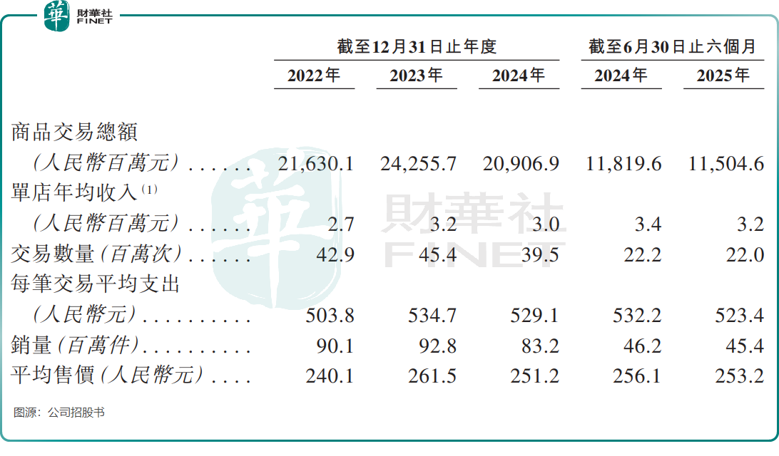 更直观的是经营端的疲软,自2024年以来,公司的GMV(商品交易总额)、交易数量、销量及单店年均收入均同步下滑,曾经“门店排长队”的盛况不再。就连不少加盟商也选择黯然退场,仅2025年上半年就有195家加盟店闭店,当期净减少131家加盟店。