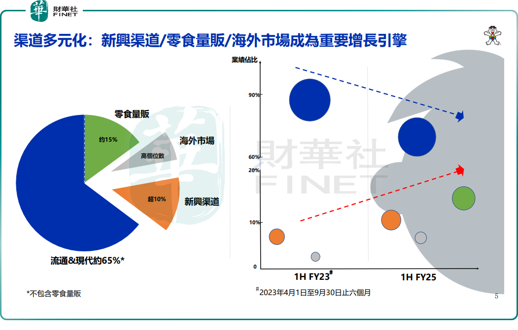 分渠道看,2025上半财年中国旺旺在内容电商、社交电商、OEM渠道等新兴渠道收益保持了双位数增长,占集团总收益比已逾10%,成为公司增长的重要动力之一。