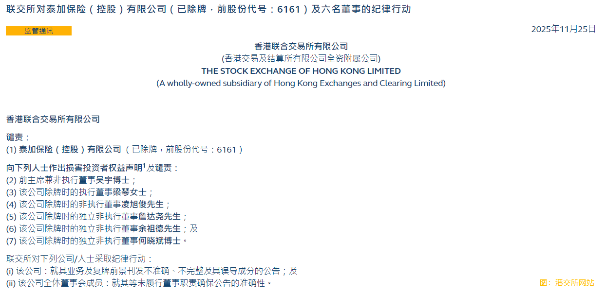 【财华社讯】11月26日,据港交所发布,2025年11月25日,香港联交所对已除牌的泰加保险(控股)有限公司(前股份代号:06161.HK)及六名前董事采取纪律行动,包括谴责公司,并对六名董事作出谴责及损害投资者权益声明。