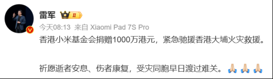 【财华社讯】11月27日,小米创办人,董事长兼CEO雷军在微博发文表示:“香港小米基金会捐赠1000万港元,紧急驰援香港大埔火灾救援。祈愿逝者安息、伤者康复,受灾同胞早日渡过难关。”