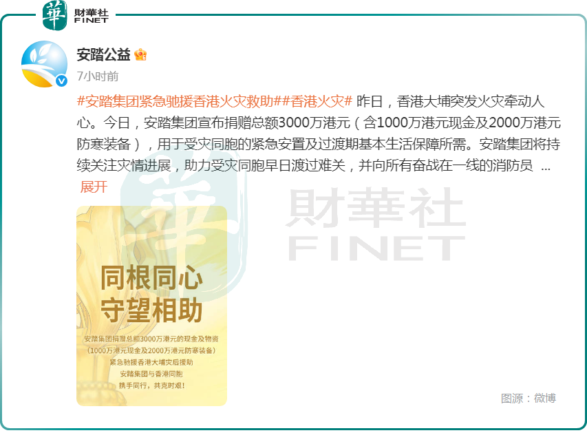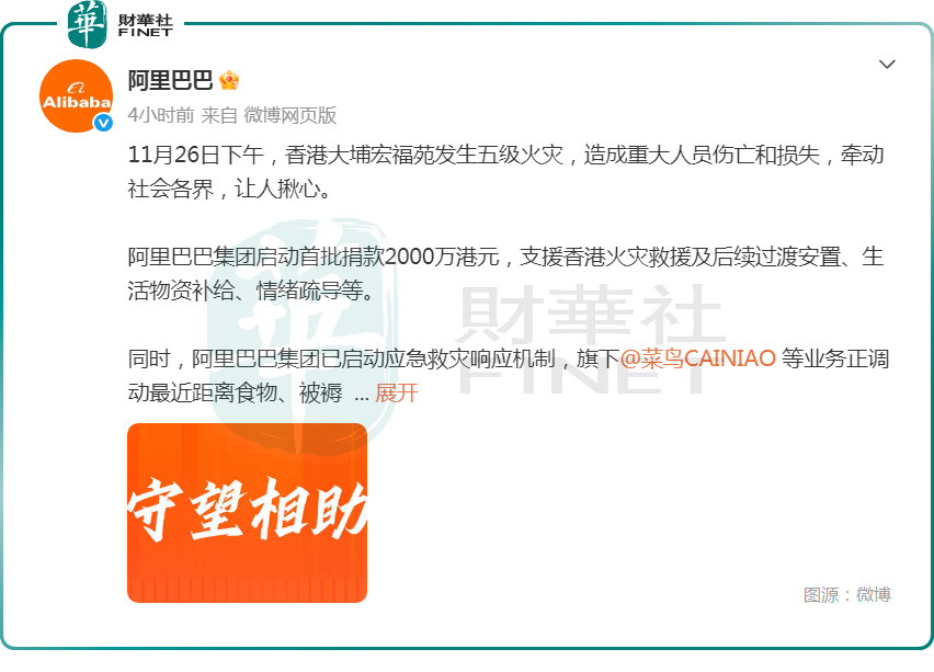 其中,阿里巴巴(09988.HK)方面也宣布,集团启动首批捐款2000万港元,支援香港火灾救援及后续过渡安置、生活物资补给、情绪疏导等。