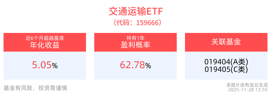 回撤方面,截至2025年11月27日,交通运输ETF近半年最大回撤5.80%,相对基准回撤0.04%。