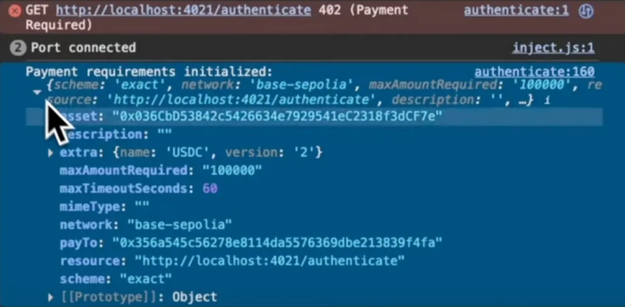 想象一下 Substack 对一篇优质文章收取 0.5 美元。当你点击“付费阅读”按钮时,Substack 会返回一个包含价格、接受的资产(例如 USDC)、网络(例如 Base 或 Solana)以及政策的 402 代码。内容大致如下: