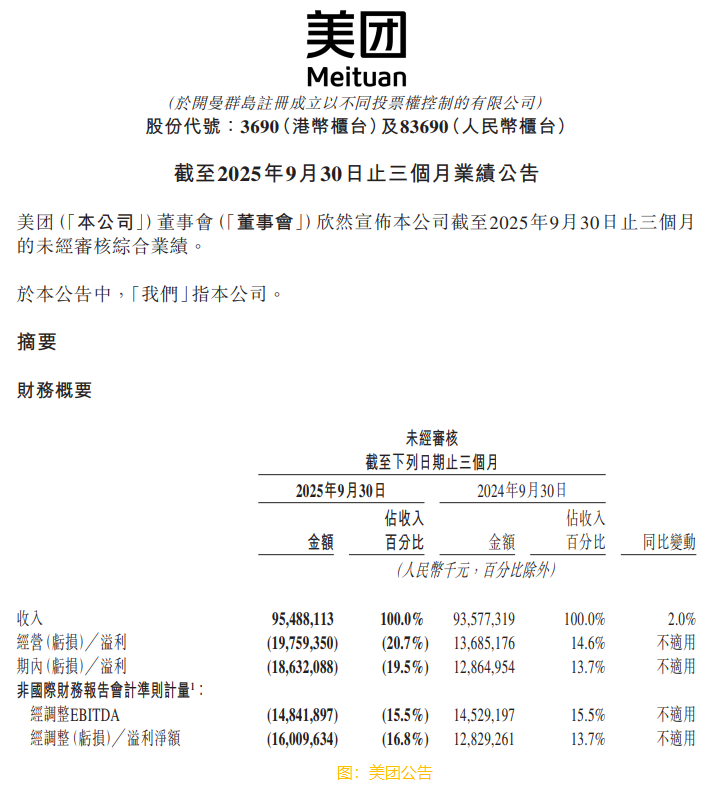 【财华社讯】美团-W(03690.HK)公布,截至2025年9月30日止三个月,收入954.88亿元(人民币,下同),同比增长2.0%;公司权益持有人应占亏损186.32亿元,上年同期为溢利128.65亿元。