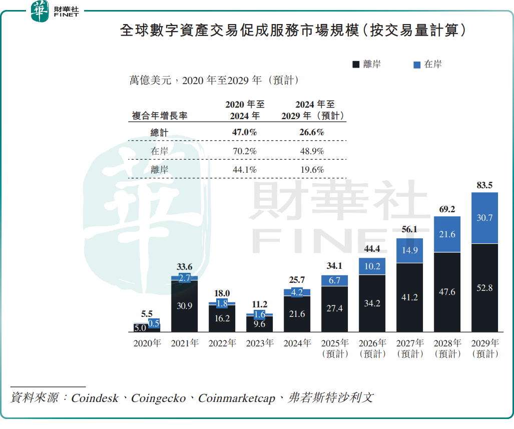 根据Coindesk等数据,全球数字资产交易促成市场的规模预计将在2024年至2029年以26.6%的复合年增长率持续扩张,到2029年有望达到83.5万亿美元,行业增长前景十分广阔。