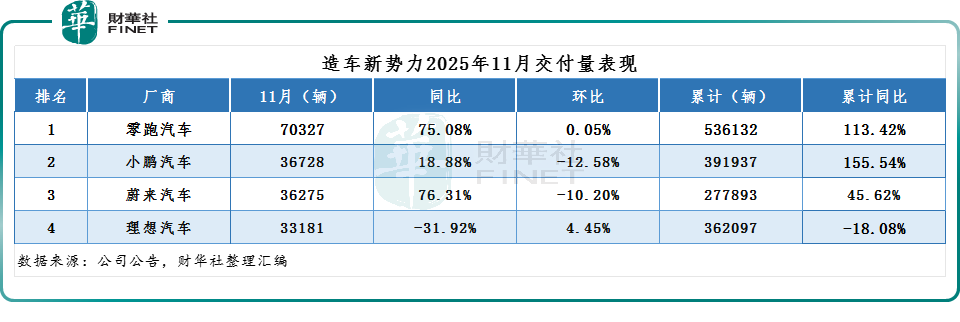 在新势力阵营中,零跑汽车11月交付70327辆,同比增长75.08%,环比增长0.05%,已连续九个月保持增长态势。1-11月,零跑汽车累计交付了53.61万辆汽车,同比大增113.42%。