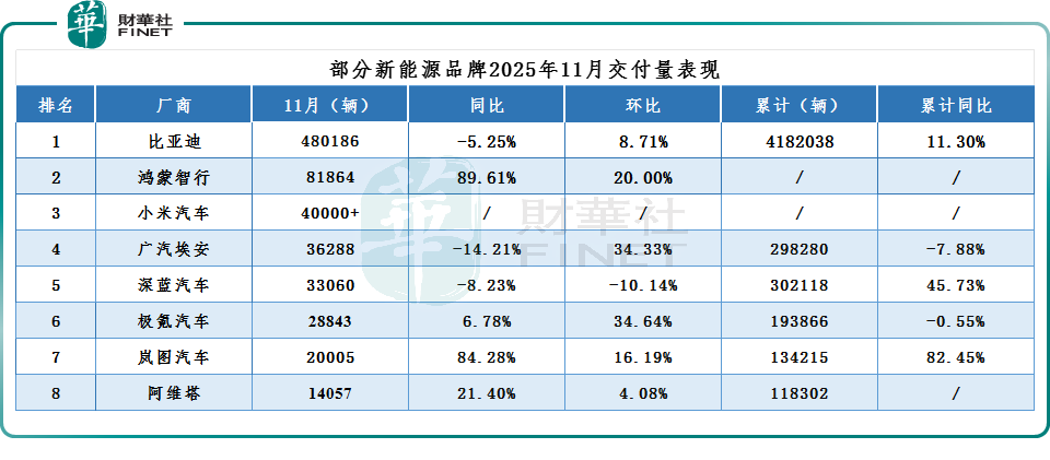再来看看其他品牌,广汽埃安11月销量为36288辆,同比下滑14.21%,环比增长34.33%。深蓝汽车11月销量33060辆,同比下降8.23%。