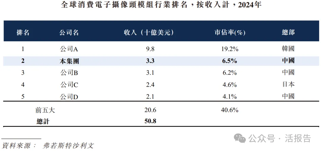 (i)按收入计,2024年在全球消费电子摄像头模组行业排名第二,在中国厂商中排名第一,市场份额为6.5%;