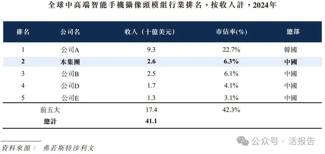 根据弗若斯特沙利文的资料,公司是全球头部中高端品牌智能手机厂商的主力供应商,亦是在摄像头模组领域全球唯一一家能同时服务两大智能手机系统生态的精密光学解决方案提供商。