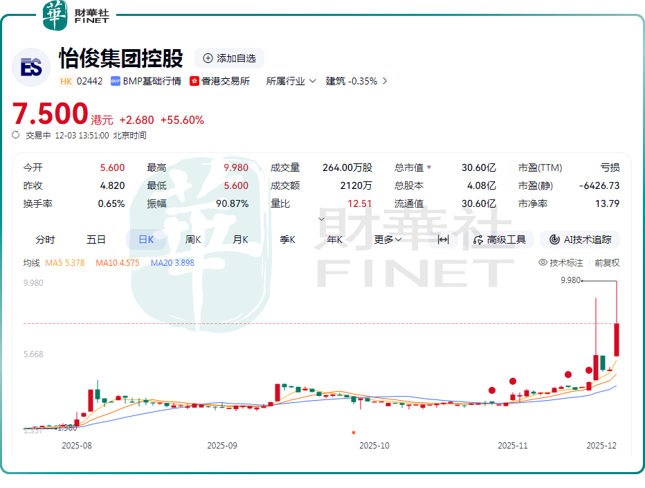 12月3日,怡俊集团控股(02442.HK)复牌即上演股价暴动,盘中一度涨逾107.05%,报9.98港元/股,创下公司上市以来股价新高。截至发稿前,该股仍维持强势,报7.50港元/股,涨幅为55.60%。