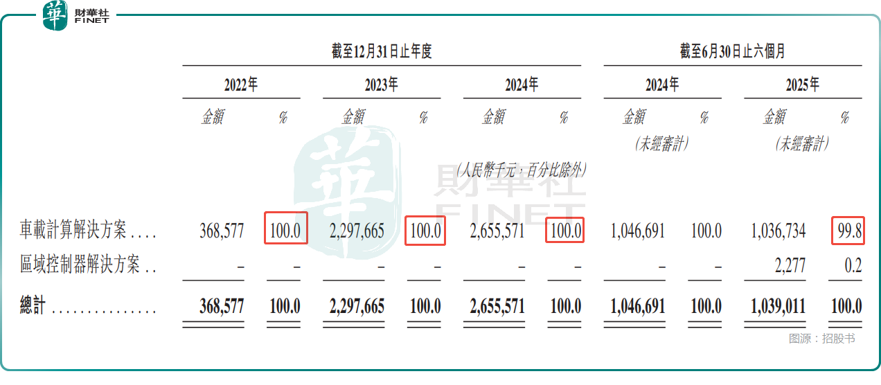 招股书显示,公司的业绩对车载计算解决方案这项业务依赖较高。2022年至2024年,这项业务的收入占总收入的比重均为100%,今年中期的收入占比为99.8%。