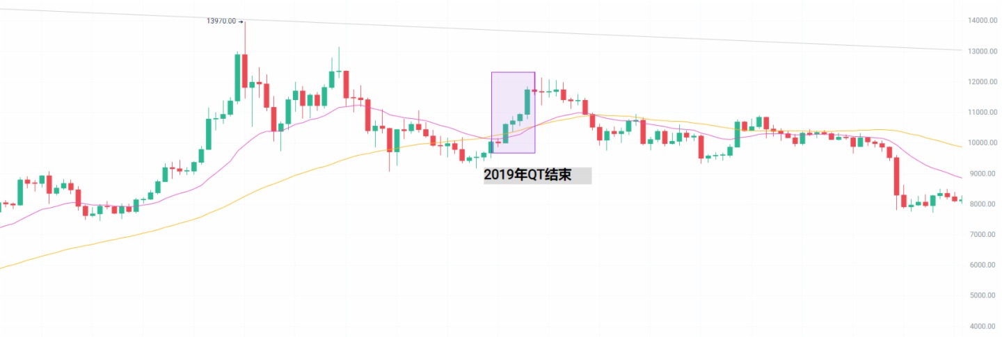 7月31日,美联储在联邦公开市场委员会(FOMC)会议上宣布,将于2019年8月1日正式结束量化紧缩(QT)计划。此时,比特币刚刚经历了一轮接近30%的大幅回调,回落至9400美元左右。在美联储宣布停止QT后,7月31日当天最大上涨了6%,并在随后几天的时间内再次回到了12000美元的关口。
