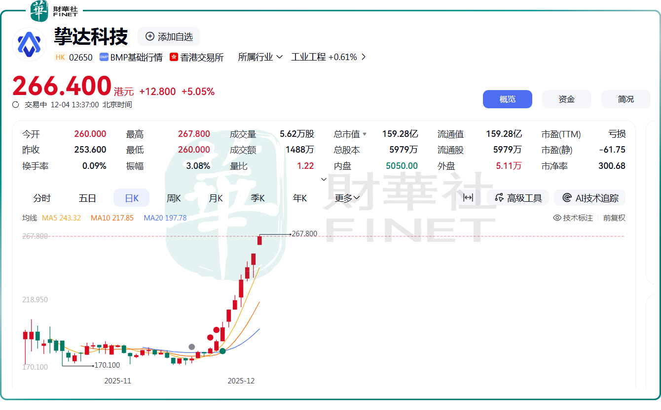 12月4日,充电桩赛道龙头挚达科技(02650.HK)股价再度攀升,截至发稿前,涨幅为5.05 %,报266.4港元/股。