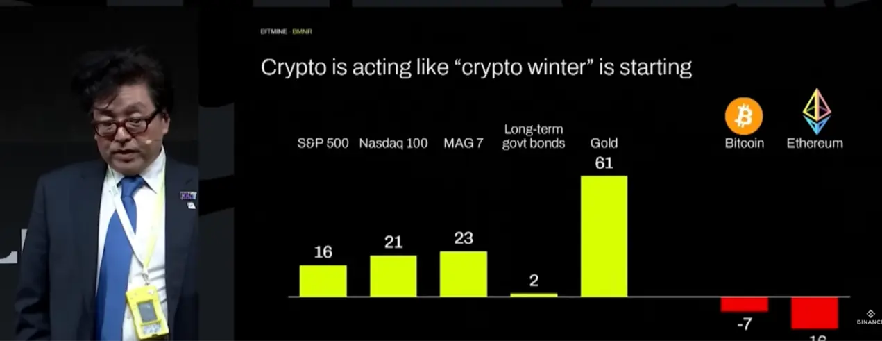 尽管看好加密货币的长期前景,但Tom Lee坦言,当前加密市场的表现如同“寒冬”,与传统资产形成鲜明对比,黄金今年迄今上涨了61%,标普500指数上涨近20%,而比特币和以太坊却是负回报。Arca的Jeff Dorman有篇文章标题很好:“无人能解释的抛售”。