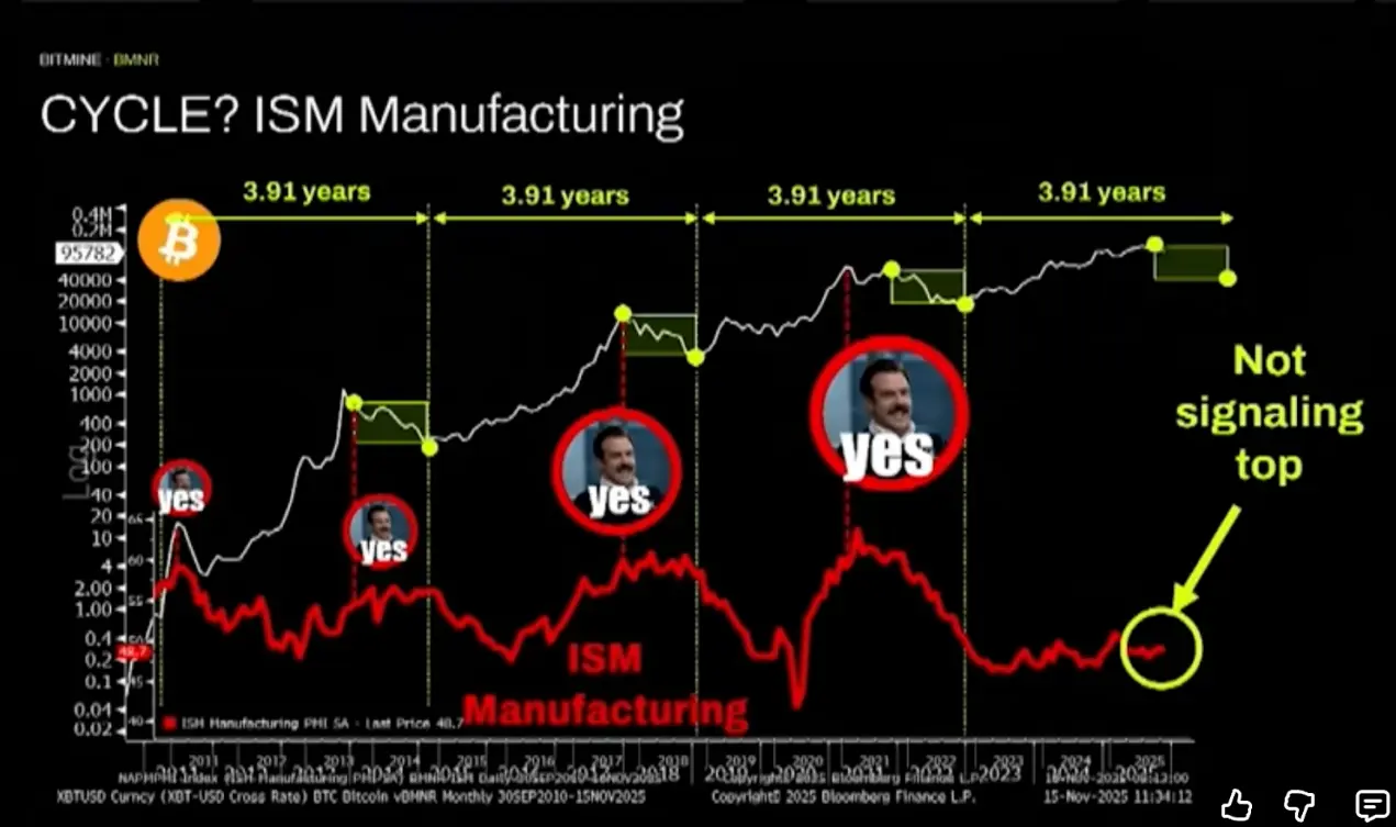 根据Tom Lee的说法,过去铜金比(衡量工业活动与货币基础的比率)和ISM指数都呈现出与比特币价格高度相关的四年周期。然而,这一次,这两个指标都没有遵循四年周期。铜金比本应在今年见顶,但没有;ISM指数在50以下停留了近三年半,也未见顶。