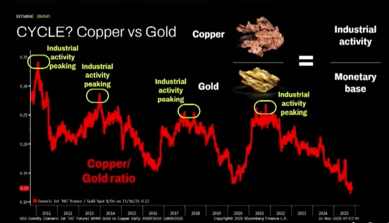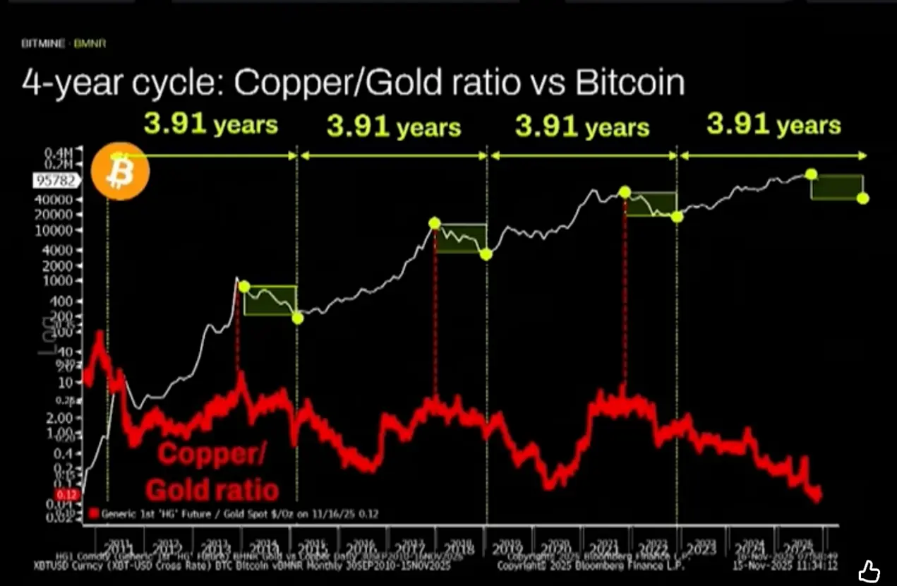 另外,Tom Lee还谈到了困扰所有人的“比特币四年周期”,他指出,历史上,它三次都精准预测了顶部和底部,主流解释通常与减半周期、货币政策等相关。但Fundstrat团队发现,“铜金比”和“ISM制造业指数”(即传统经济周期)这两个指标,与比特币周期的关联性甚至更强。