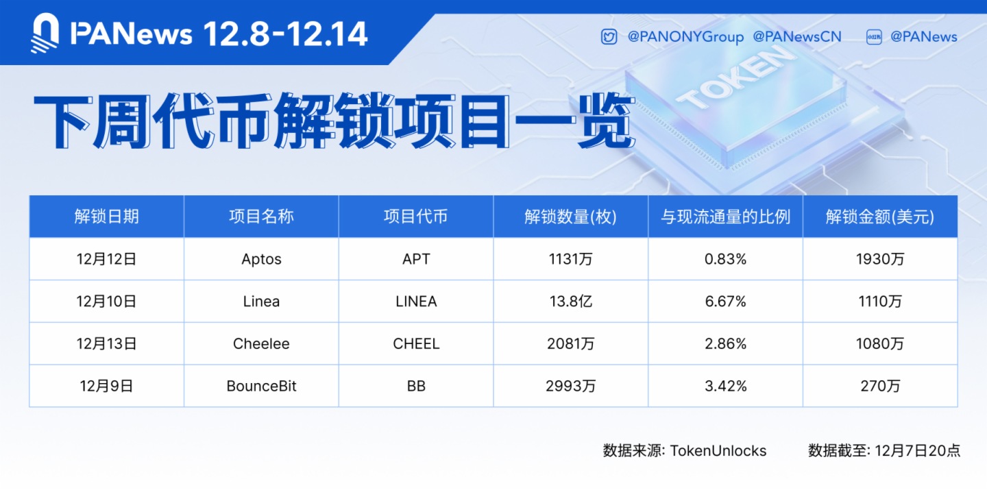 PANews 12月7日消息,Token Unlocks数据显示,APT、LINEA、CHEEL等代币将于下周迎来大额解锁,其中: