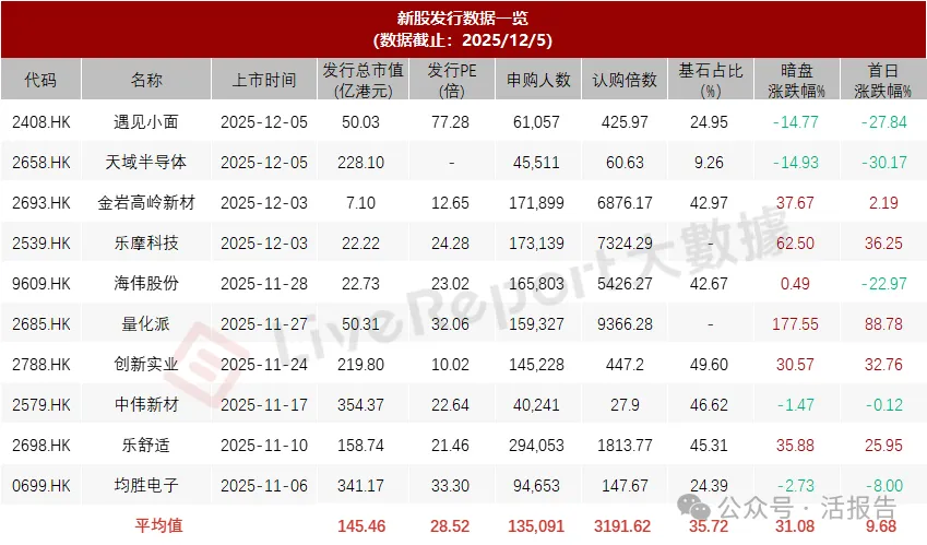 据LiveReport大数据,近10家上市新股平均发行市值为145.46亿,最大市值为中伟新材,最小市值为金岩高岭新材;平均发行PE为28.52倍,PE处于中上水平;平均申购人数为135,091人,平均认购倍数为3191.62倍;平均基石占比为35.72%,基石平均比例略有下降;